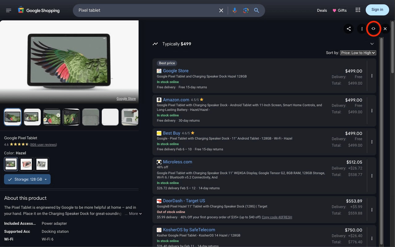 The Google Shopping product panel is the right-hand sliding interface that appears when a product is selected from the Google Shopping search results.
